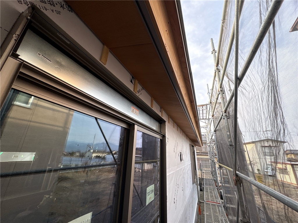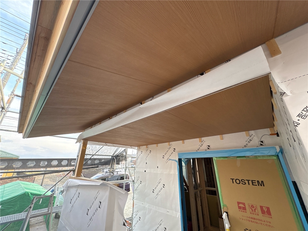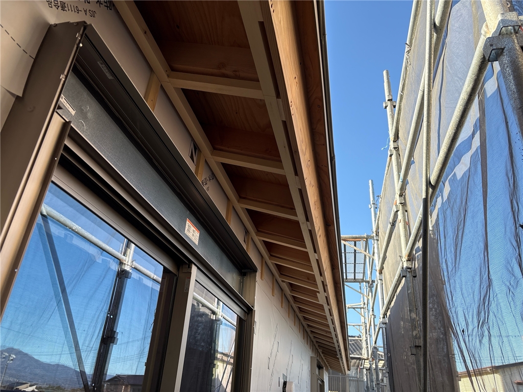 先日、外壁の耐力面材を貼り終わり、今日は外壁下地や軒天井の状況をお伝えします