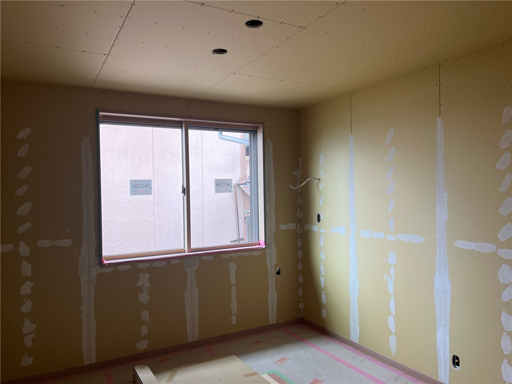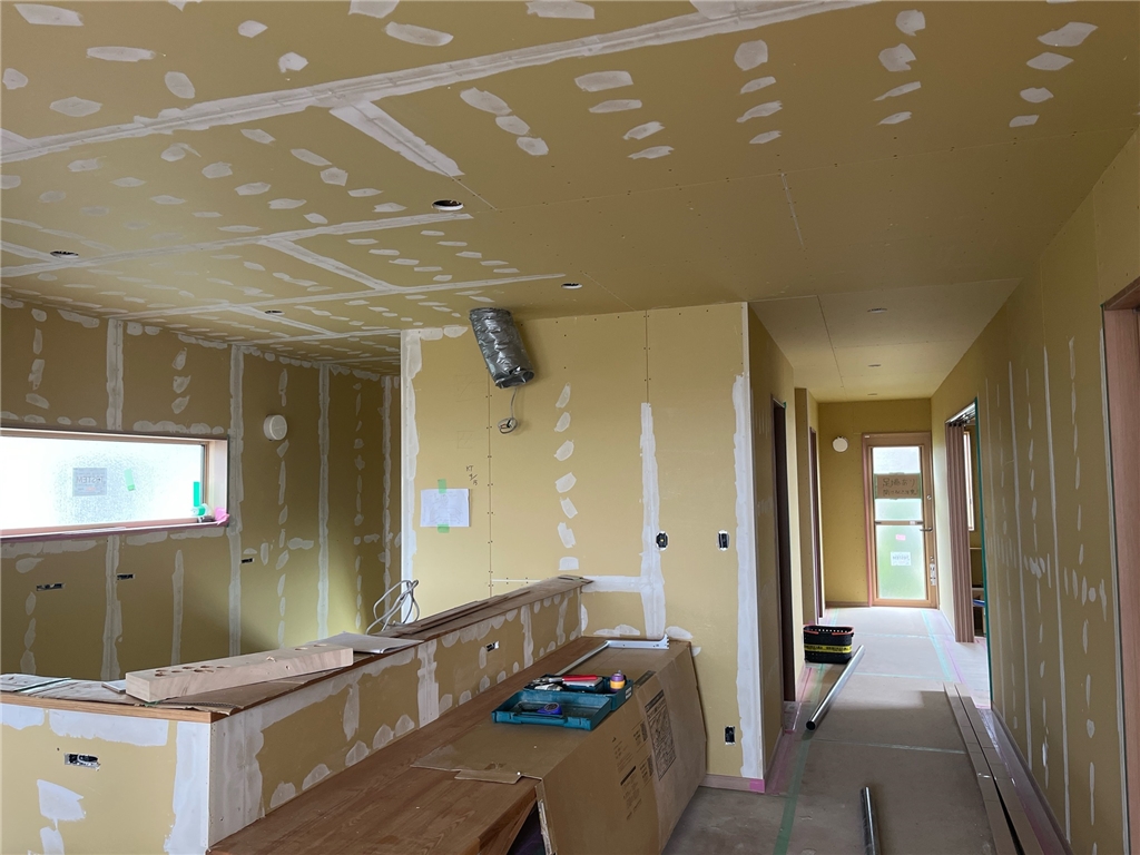 ↓壁・天井の石膏ボードを貼り終わり大工さんの工事がほぼ完了したので